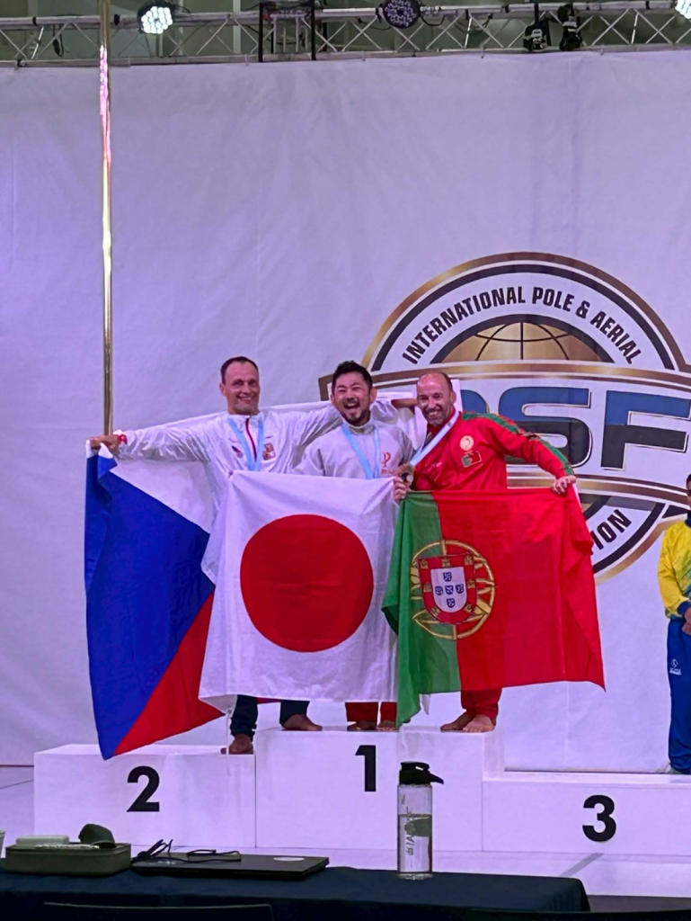 So, we explained the situation to the representatives at the Japanese branch of the organization and showed them a letter of diagnosis from a doctor (explaining that I had transitioned and spent the last 20+ years living as a man, as well as regularly receiving testosterone injections). They gave me permission to participate in the competition in Japan in 2024. Pole sports competitions are divided into men’s and women’s categories as well as by age. They also have amateur and elite divisions. The differences between the amateur and elite divisions are things like different points for different moves, but no matter how good your showing is in the amateur division, you can’t earn a spot at the world championship. Since it was my first competition, I entered in the amateur division, but I ended up winning. Competitions are hard, but the feeling of accomplishment and the joy of it led me to want to try the elite division in the next one in 2025. I wasn’t looking to win, I was just enjoying putting my all into practicing and having my effort recognized. So, in the 2025 Japan championship’s 40+ men’s elite division, I got second place. If you get first place, you’re guaranteed a spot in the world championship, but according to the rules, if you place second but earn over a certain number of points, you also get a spot. I was able to do that, so I earned a place in the world championship. The championship organizers said nothing against it, so I entered in the men’s category for the 2025 championship in Argentina, and won in the 40+ men’s division.